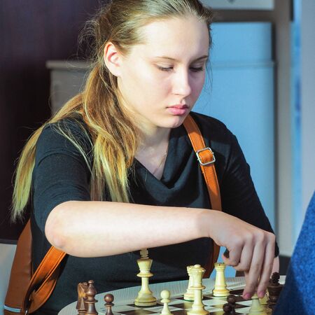 Krasnoyarsk, Russia-January 28, 2019 : city blitz tournament in chess club. A young girl makes a move at the chessboard.