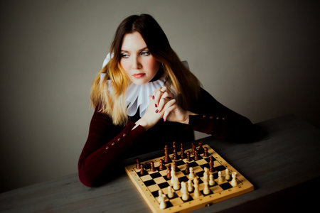 Portrait of a beautiful elegant woman in a burgundy dress with a frill, who is sitting in front of a chessboard with her hands crossed thoughtfully. A difficult game. Mat.