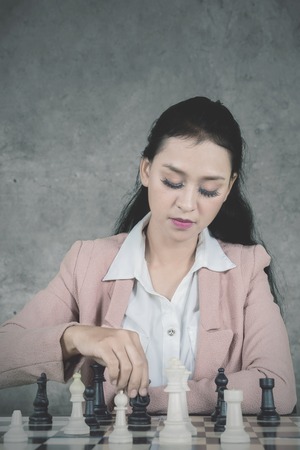 Portrait of a beautiful female entrepreneur doing a checkmate on the chess board during the chess game