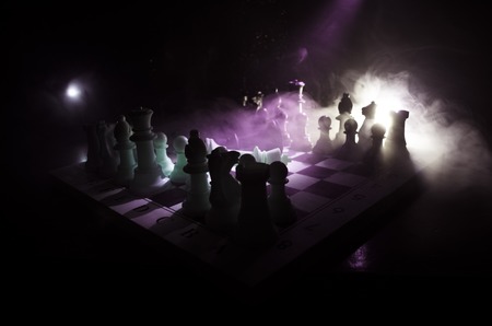 Chess board game concept of business ideas and competition and strategy ideas concep. Chess figures on a dark background with smoke and fog. Selective focus