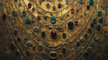 This captivating image showcases a stunning array of vintage jewelry pieces adorned with colorful gems, displayed gracefully against a luxurious golden background.