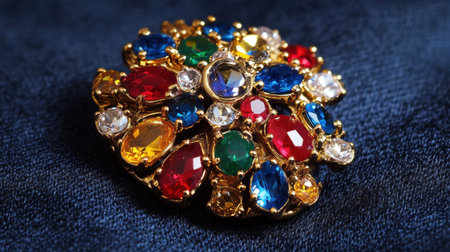Close-up of an elaborate gemstone jewelry piece sparkling with colors
