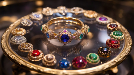 A stunning arrangement of exquisite jewelry pieces featuring colorful gems and rings displayed on a decorative tray. Perfect for luxury, fashion, or jewelry themes.
