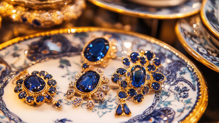 This stunning image captures exquisite blue gemstone jewelry artfully arranged on ornate antique plates, showcasing elegance and superior craftsmanship.