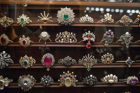 An assortment of different types of brooches displayed in a case, showcasing their various designs and styles, A display of various hair accessories adorned with gemstones and pearls, AI Generated