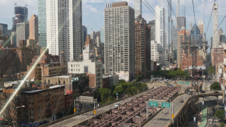 New York City Roosevelt Island tramway to Manhattan Midtown streets. American cable tram near Queensboro Bridge. Urban public transport in USA. Upper east side building architecture, skyline cityscape