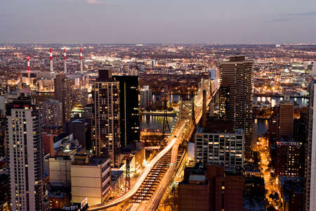 New York City Manhattan skyline cityscape. Queensboro Bridge from Queens to Midtown. Rooftop view point, roof in Long Island, United States. NYC urban architecture in Hunters Point