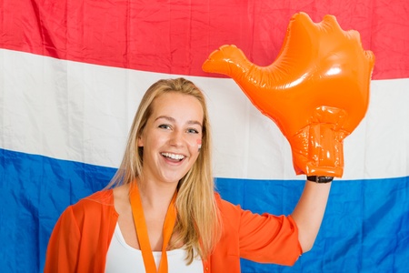 Portrait of happy young Dutch Sports fan wearing inflatable hand cheering, standing in front of the flag of the Netherlands