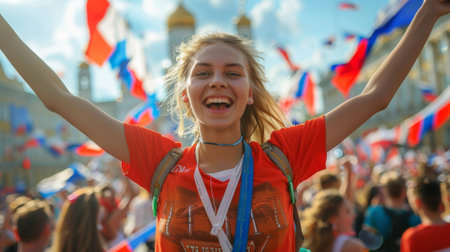 Cheerful young woman with raised arms in lively crowd on sunny day in russia