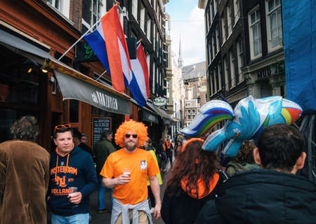 Amsterdam, Netherlands - 27 April, 2017: Streets of Amsterdam with orange decorations full of people in orange during the celebration of kings day. Man with orange hair holds beer on street