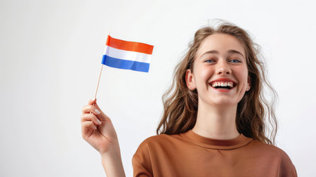 A happy young woman holds a small Netherland flag and smiles. The flag is red, white and blue. Immigration and citizenship. Tourism and adventure. Independence Day. Patriotism and pride