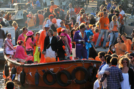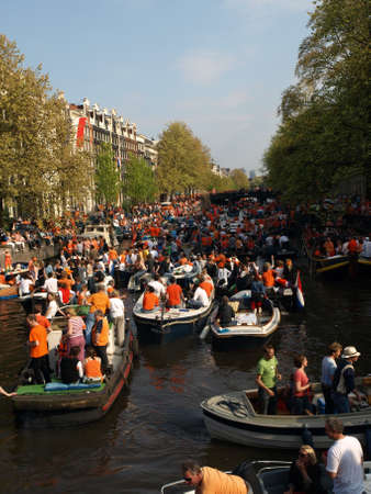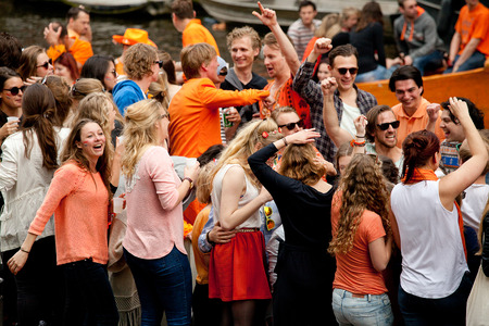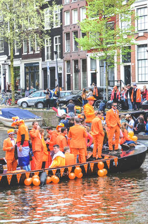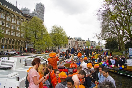 AMSTERDAM, NETHERLANDS - APRIL 30, 2013 : People in orange cruising through the canals from Amsterdam during the coronation of the new king Willem Alexander from the Netherlands.