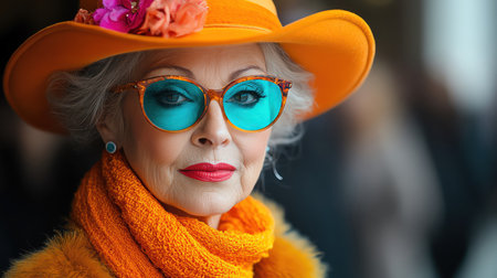 Radiant elderly black woman with colorful hat and glasses smiling warmly