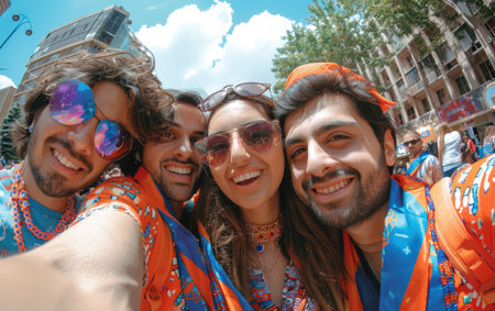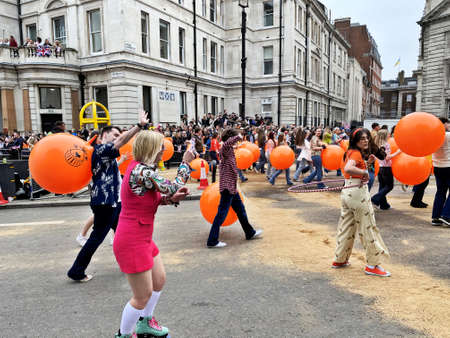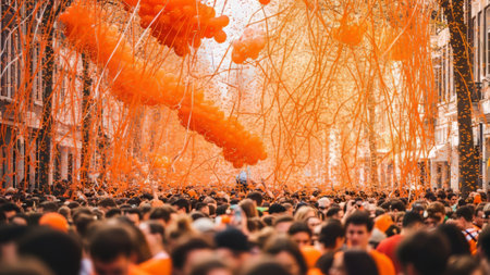 Crowd in orange, street party, balloons, streamers, celebration