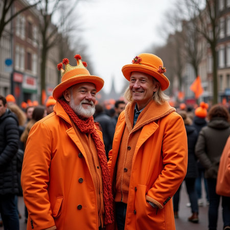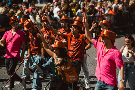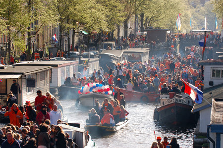 Amsterdam, The Netherlands - April 27, 2023: Locals in orange celebrating Kings Day on the canals in Amsterdam the Netherlands