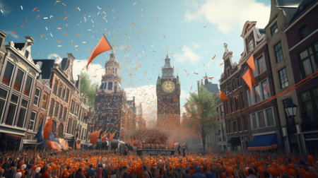 Crowd of people on the street of Amsterdam during the celebration of the Dutch National Day