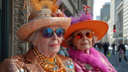 Stylish older women in bright, colorful hats and sunglasses, walking in a fashion show