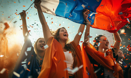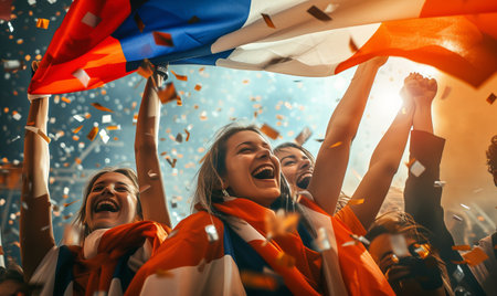 Ecstatic sports fans in blue attire are jubilantly celebrating a team victory, holding a cheering energy aloft amidst a shower of confetti. AIG41