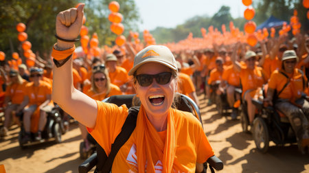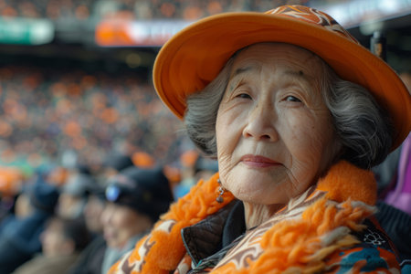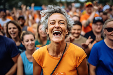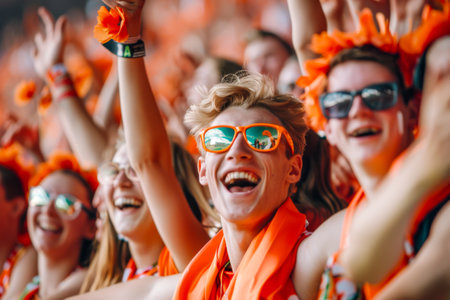 Joyful orange-dressed sports fans exit stadium after game, reflecting enthusiasm, unity, and the thrill of supporting their team.