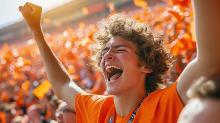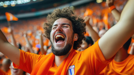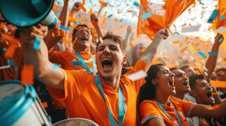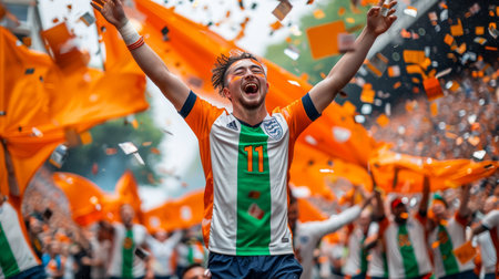 Happy Male Soccer Fan in Orange and Green Celebrates Victory Amidst Jubilant Crowd and Confetti