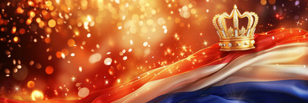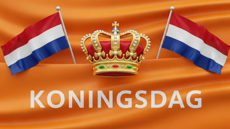 An image featuring two Dutch flags flanking a golden crown, with the text 'KONINGSDAG' prominently displayed at the bottom. The flags have horizontal stripes of red, white, and blue, and the crown is ornate with jewels. The background is a gradient of orange, symbolizing Dutch national pride.
