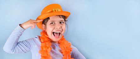 Fun in Kings Day in Holland, traditional festival on April 27 in the Netherlands. Little girl in a festive orange hat on a blue background eats colored donuts. Copy space