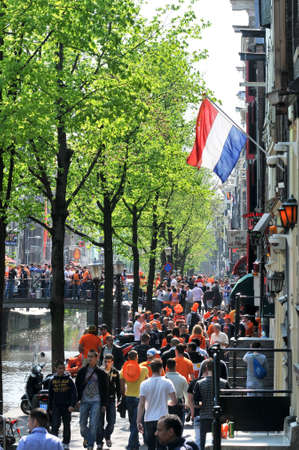 Amsterdam - April 30: Celebration of queensday on a Amsterdam canal with houseboats on April 30, 2013 in Amsterdam, The Netherlands