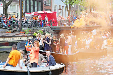 AMSTERDAM - APRIL 26: Amsterdam canals full of boats and people in orange during the celebration of kings day on April 26, 2014 in Amsterdam, The Netherlands