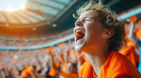 Young boy sporting orange and blue face paint, radiates joy and enthusiasm at a lively sports event, surrounded by an energized crowd celebrating their favorite team.