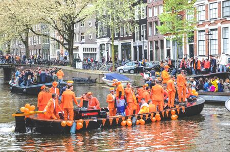 Amsterdam, Netherlands - April 27, 2019: People on party boats dressed in national orange color while celebrating the Kings day, Koningsdag, the birthday of the Dutch King Willem-Alexander.