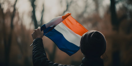 An AI generated illustration of a person holding the flag of the Netherlands in a park