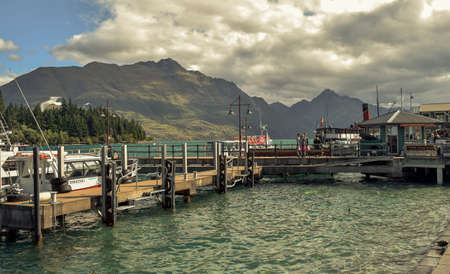 View of boat on the Wakatipu lake. Pier on Wakatipu Lake.