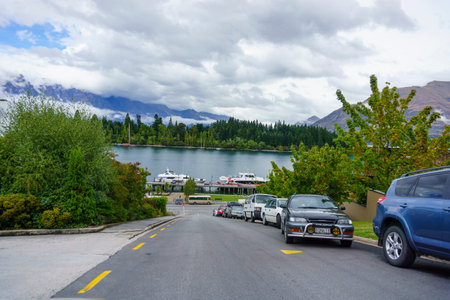 Queenstown New Zealand - February 28 2015; Cars parked along side of road sloping down towards scenic Lake Wakatipu in the tourist town.1