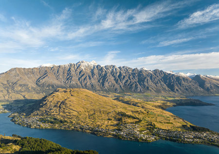 Cityscape of Queenstown and Lake Wakaitipu with The Remarkables in the background from viewpoint at Queenstown Skyline, New Zealand