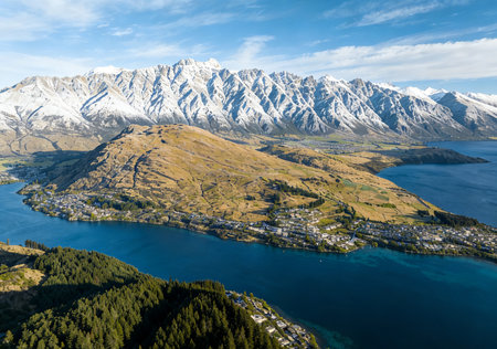 Aerial view of Queenstown at lake Wakatipu in New Zealand