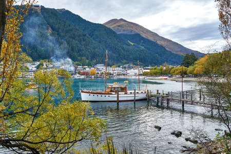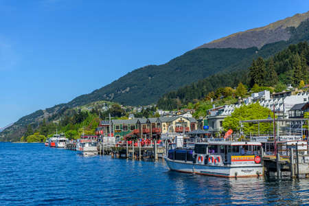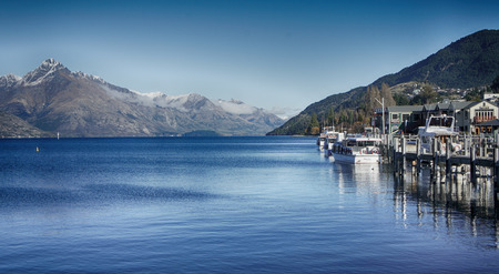 Morning in Queenstown, boats on Wakatipu lake, New Zealand