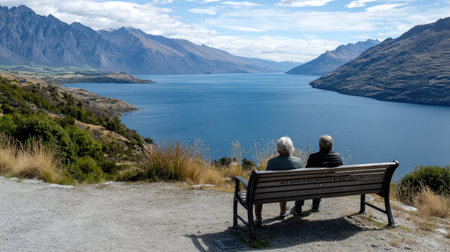 An elderly couple enjoys a tranquil moment on a bench, overlooking a stunning lake and majestic mountains, surrounded by the beauty of nature.
