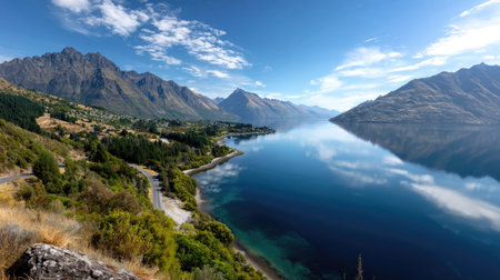 Landscape of a mountain lake, roads, mountains. Road along Lake Wakatipu, Queenstown, New Zealand.