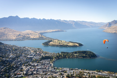 Paraglider soaring above alpine town surrounded by mountains and lake, Queenstown, New Zealand