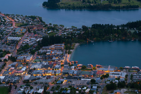 The bird's eye view of the night lights of Queenstown, South Island of New Zealand.