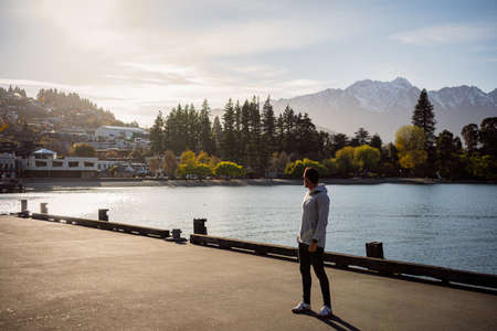 Queenstown, New Zealand, October 6, 2019: Beautiful image of a boy watching the orange sunrise among the snowy mountains