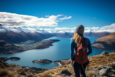 Queenstown, New Zealand, October 6, 2019: Gorgeous image of a blonde girl looking out over the blue lake with the snow capped mountains in the background