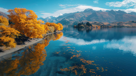 A beautiful lake with a mountain in the background. The water is calm and clear, and the trees surrounding the lake are full of autumn leaves. The scene is serene and peaceful