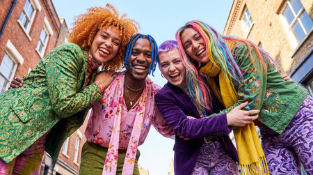 Close-up of a group of friends joyfully having fun, wearing colorful and trendy outfits on a city street.
