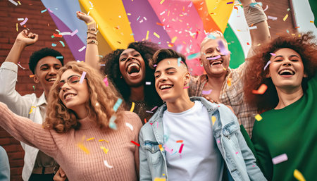 Diverse group of young people celebrating gay pride festival throwing confetti in the air, Lgbt community concept with guys and girls hugging together outdoors