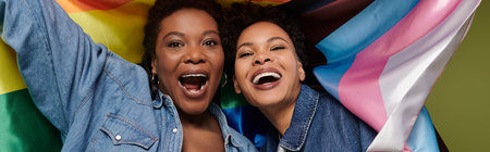 Two joyful women embrace their love under colorful flags, radiating style and happiness together.