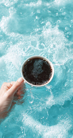 A hand holds a cup of dark liquid against a backdrop of swirling aqua-colored water. The image features a high-angle perspective, creating a visually dynamic composition. This abstract style offers creative potential for various applications including advertising, website design, and editorial content.