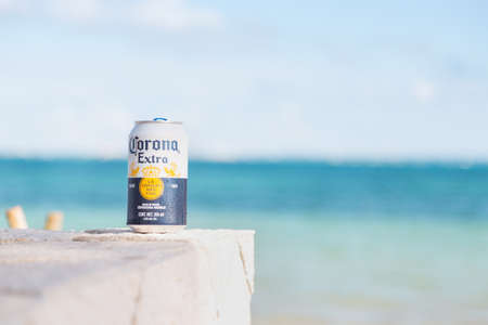 CANCUN, QR, MEXICO - FEB 4, 2019: Close-up of can of traditional Mexican Corona beer with a white sand beach with turquoise Caribbean sea in background in Cancun, Mexico.