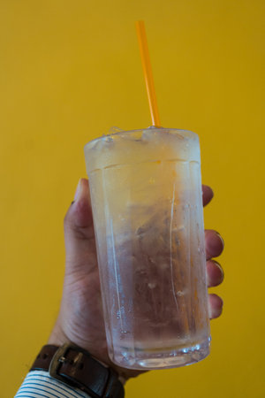 Refreshing sparkling water served in a glass with ice in a casual setting