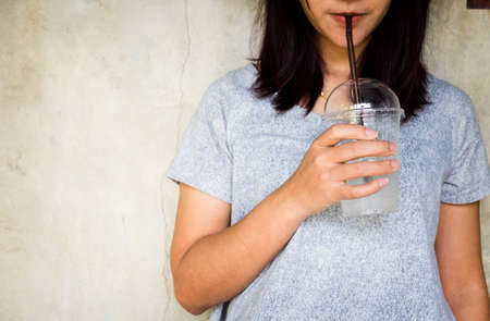 Males hand with bottle isolated over background. Tasty delicious sugary coke with plastic straw. Beverage carbonated water.